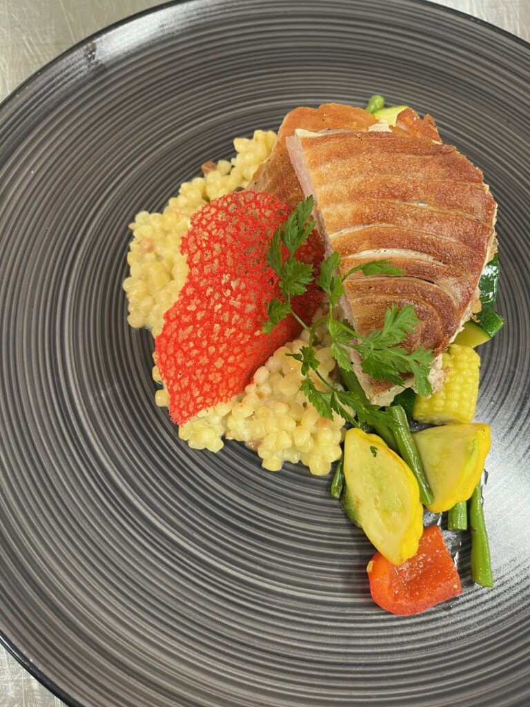 - Gelbflossen-Thunfilet auf Tomaten-Kräuter-Ragout – Beilage: Polenta, glasiertes Gemüse