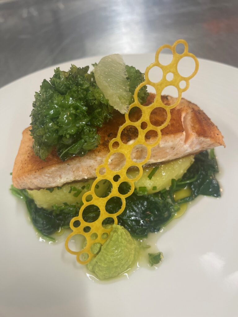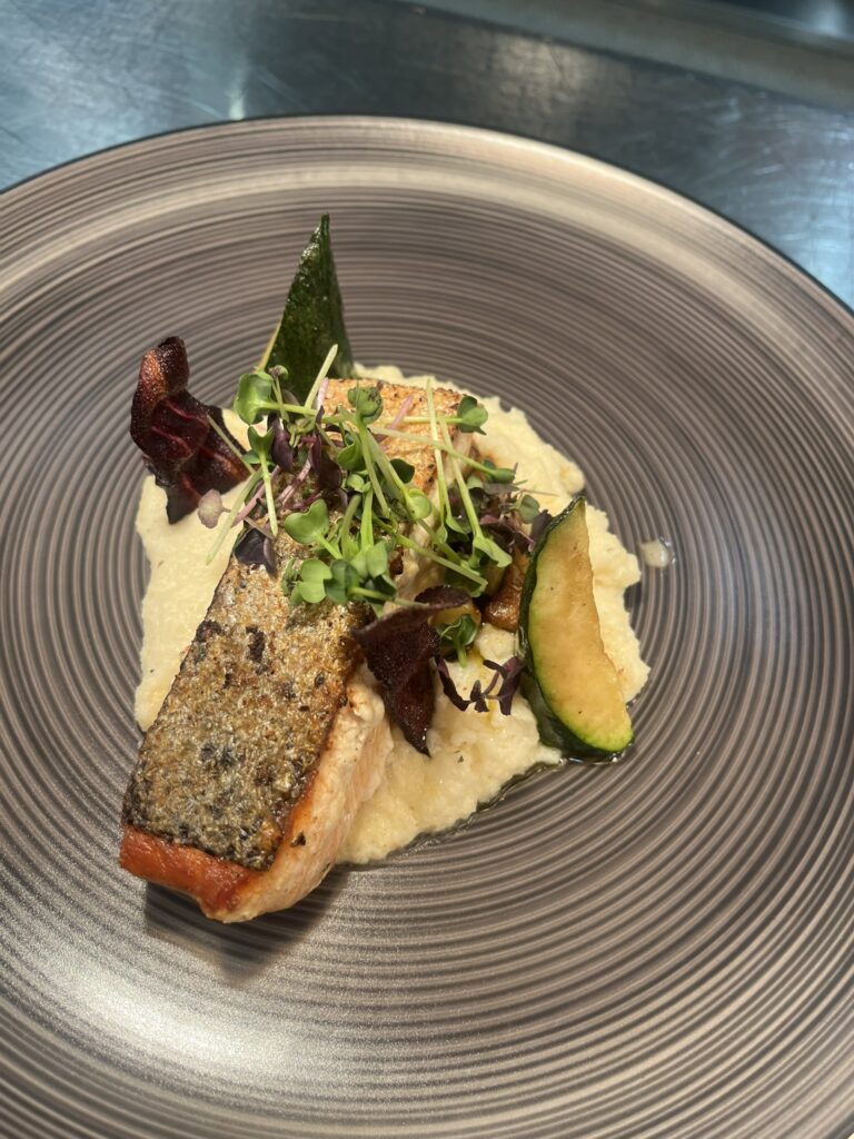 - Lachsfilet auf Kürbis-Ingwer-Creme – Beilage: Kartoffelpüree, glasiertes Gemüse