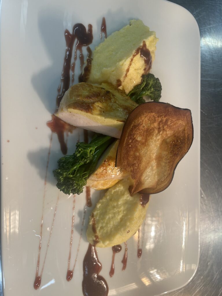 - Zackenbarsch auf Trüffel-Kürbis-Creme – Beilage: Polenta, Butterkarotten
