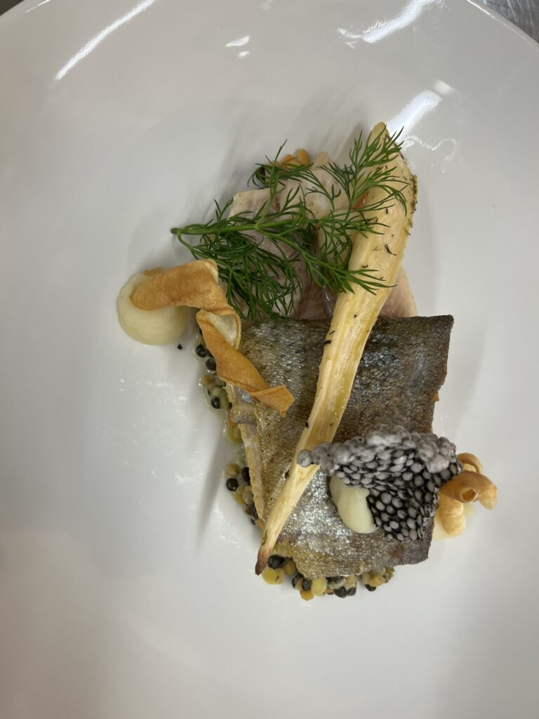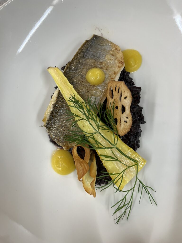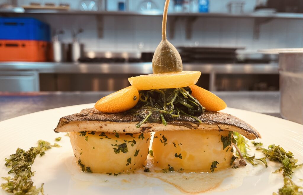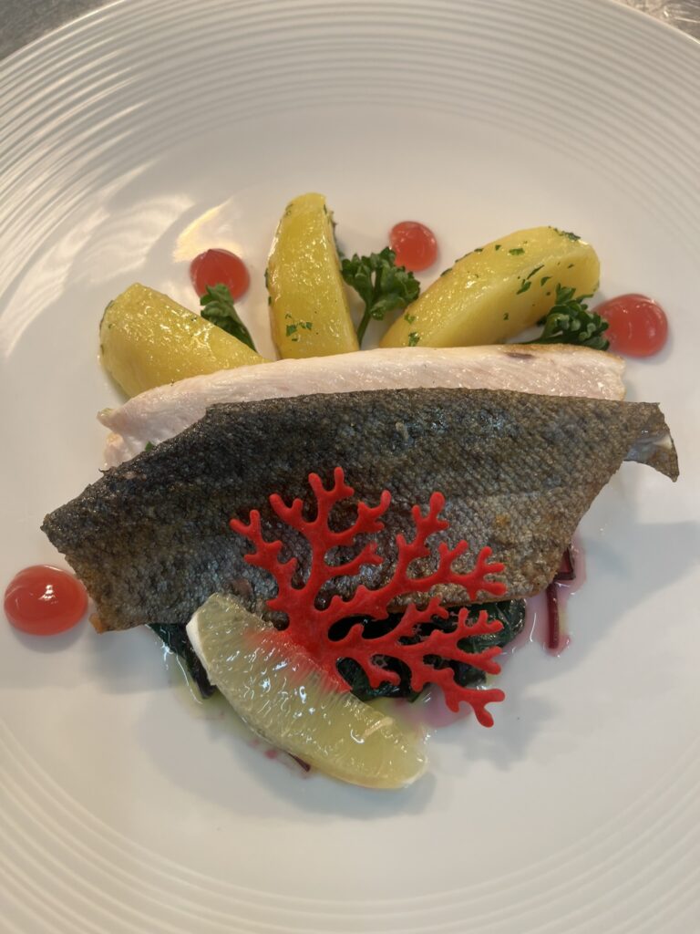 - Wolfsbarsch auf Trüffeljus – Beilage: Kartoffelgratin, Butterkarotten