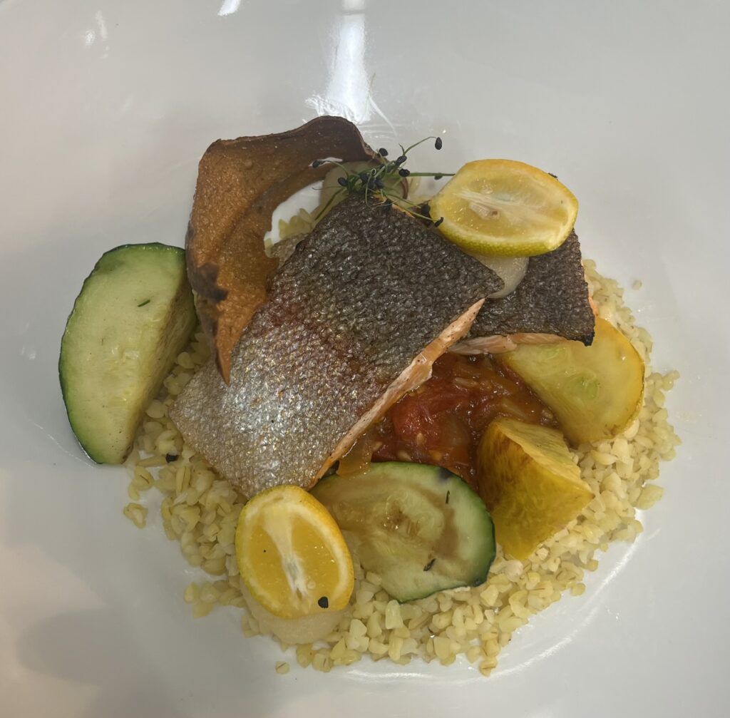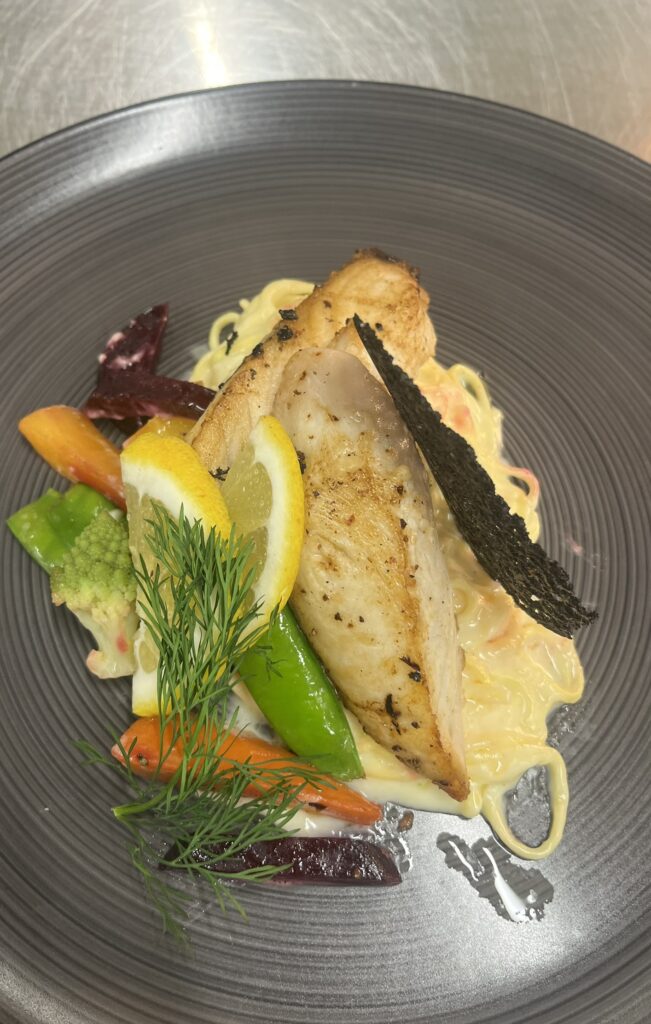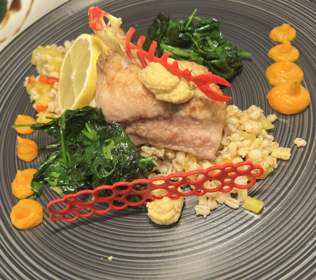 - Zackenbarsch auf Ingwer-Limetten-Sauce – Beilage: Kartoffelgratin, glasiertes Gemüse