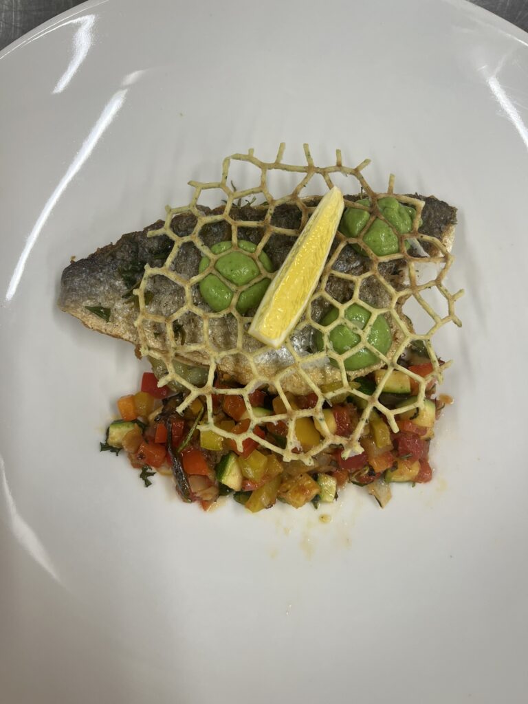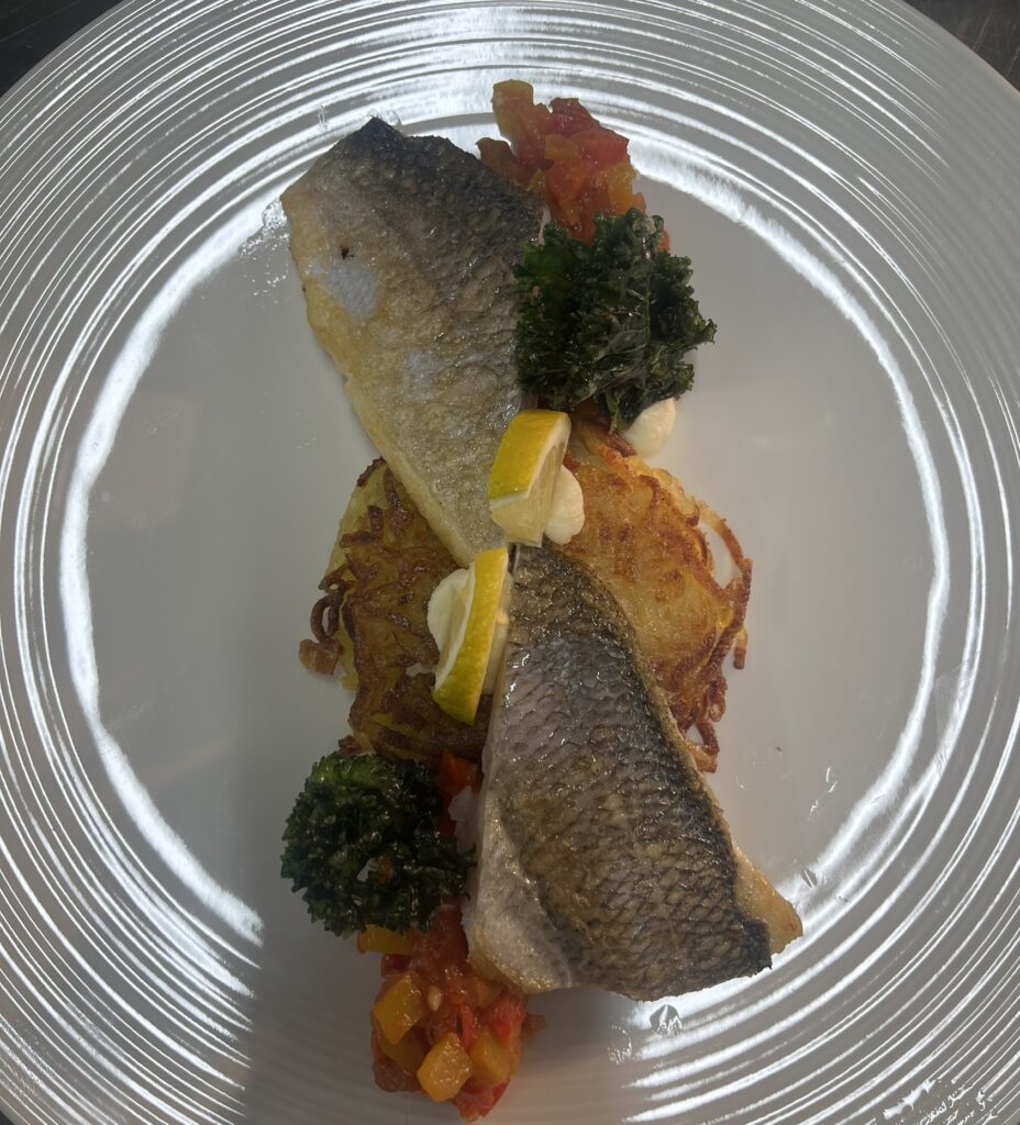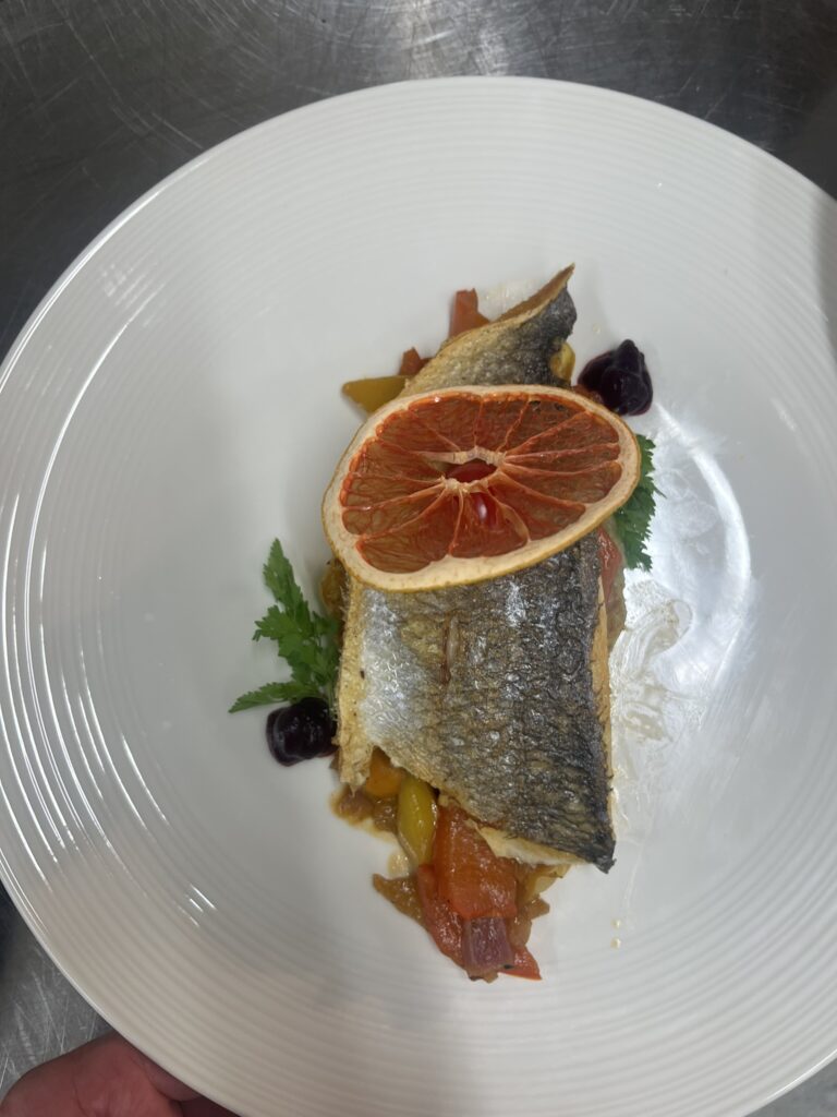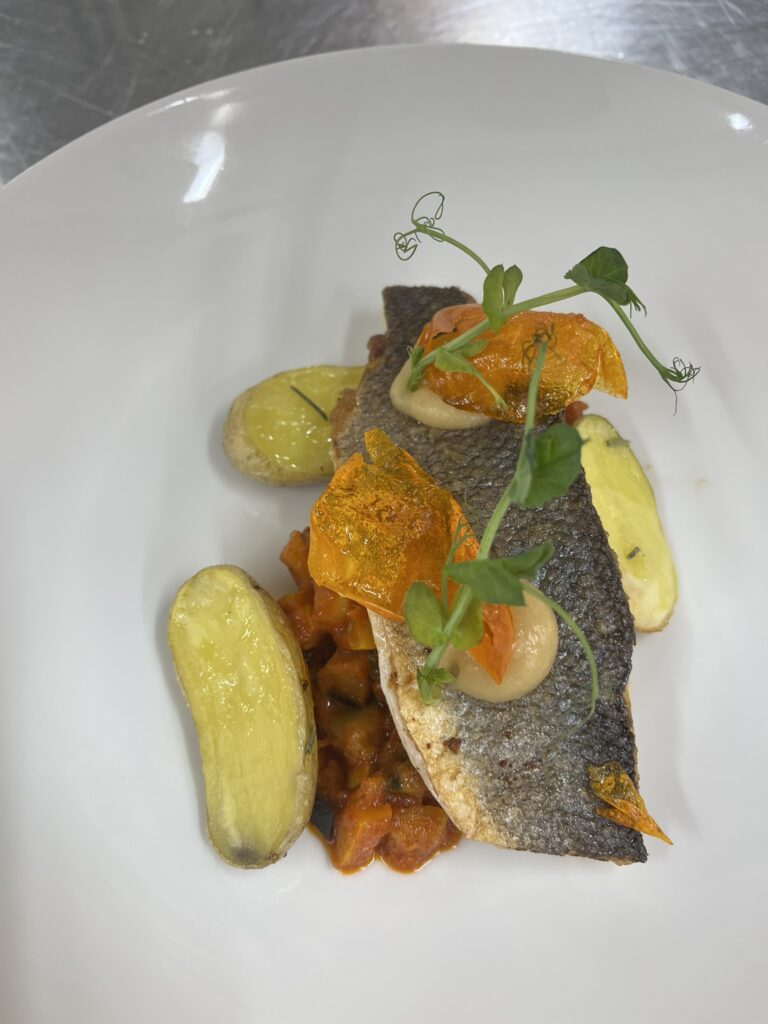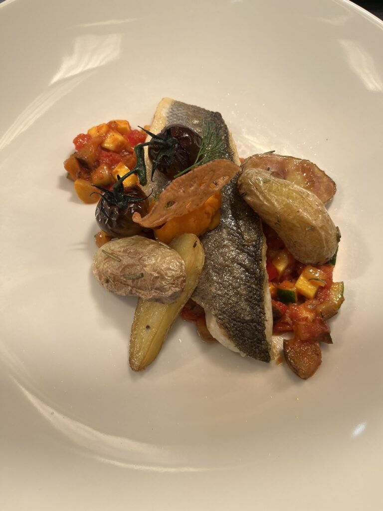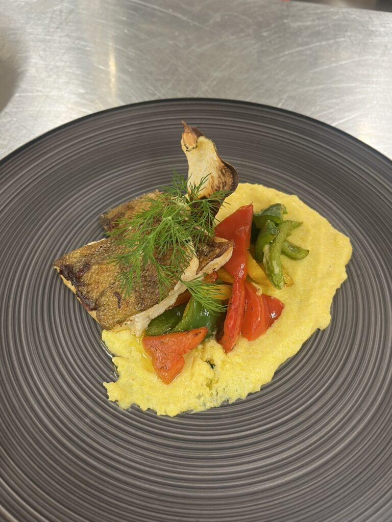 - Wolfsbarschfilet auf Tomaten-Paprika-Ragout – Beilage: Polenta, Butterkarotten