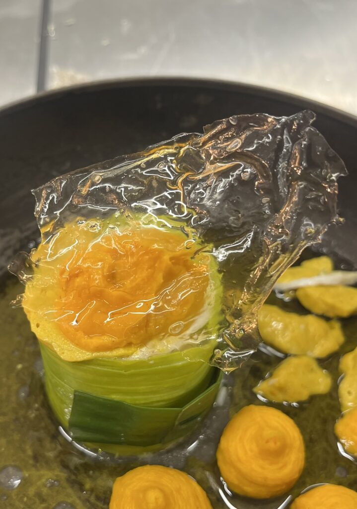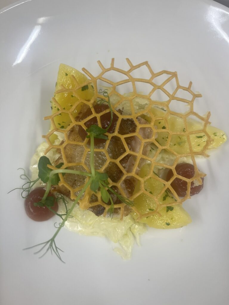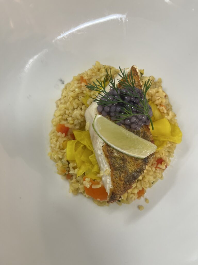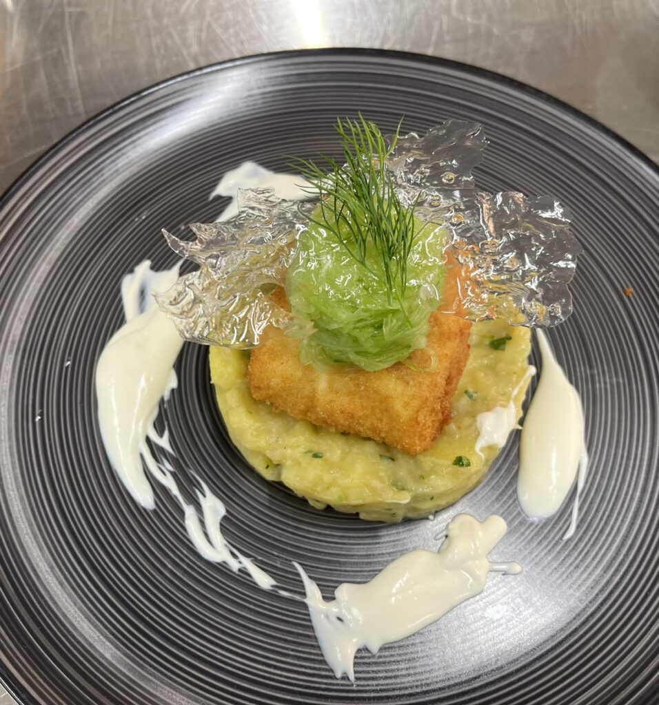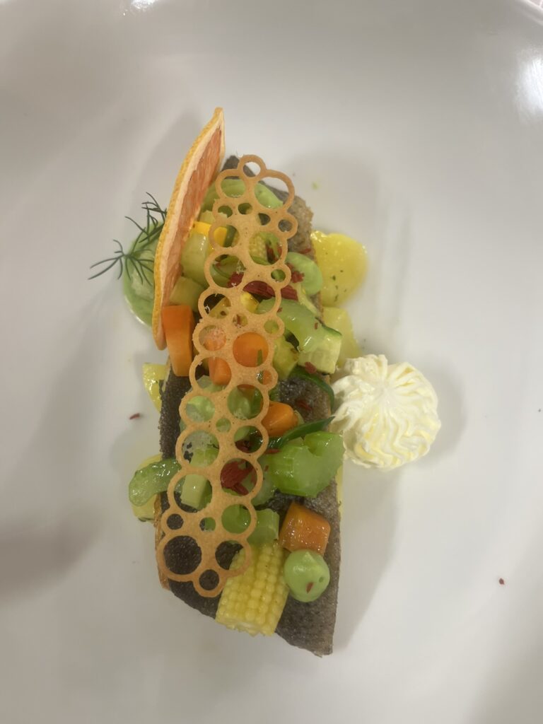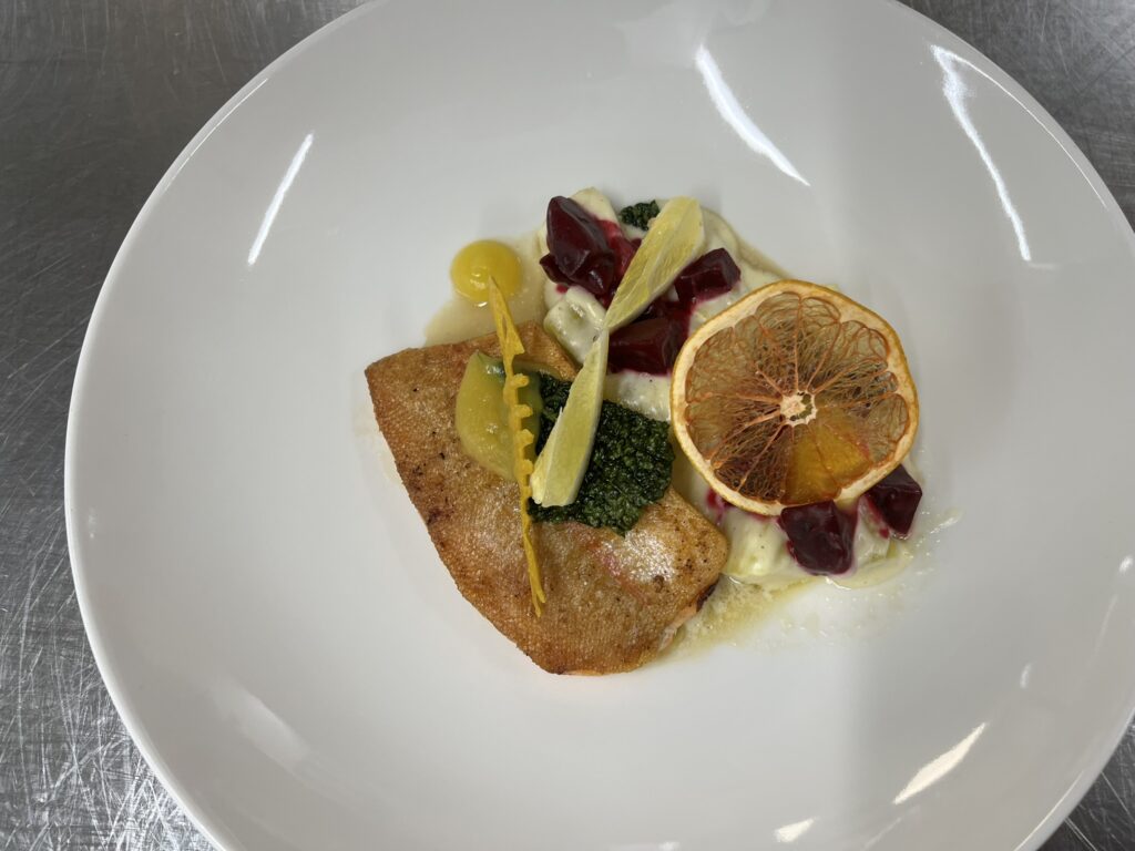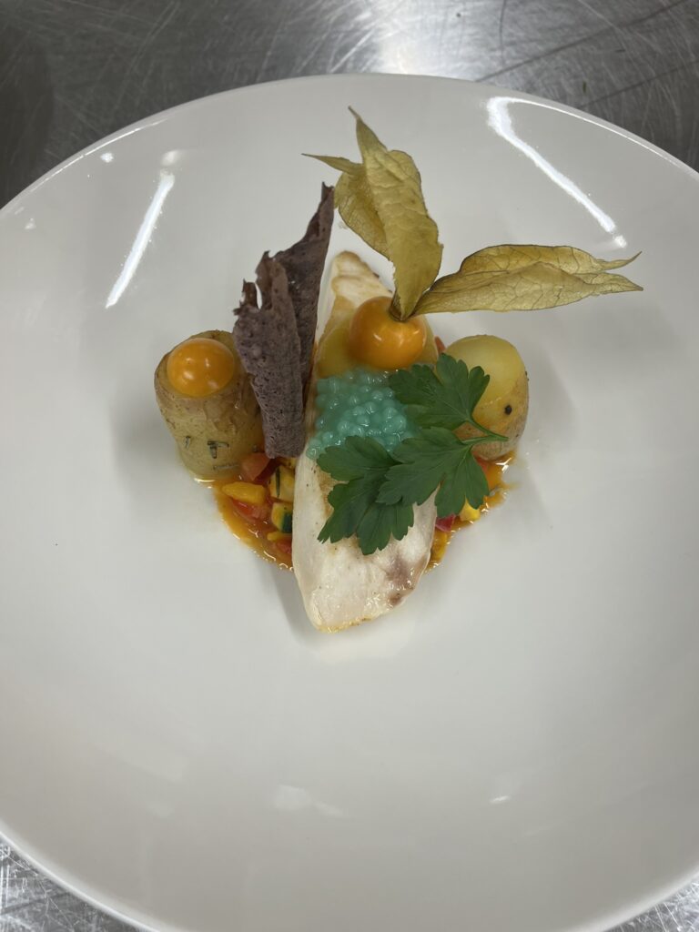 - Doradenfilet | cremiges Kartoffel – Gemüse | Dillnockerll | Orangenkaviar