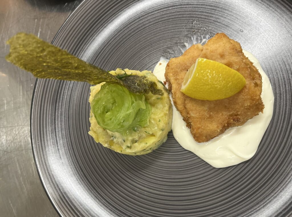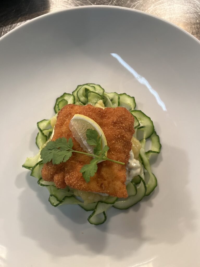 - Kabeljau gebacken | Kartoffelsalat | Gurkenspaghetti | Remoulade