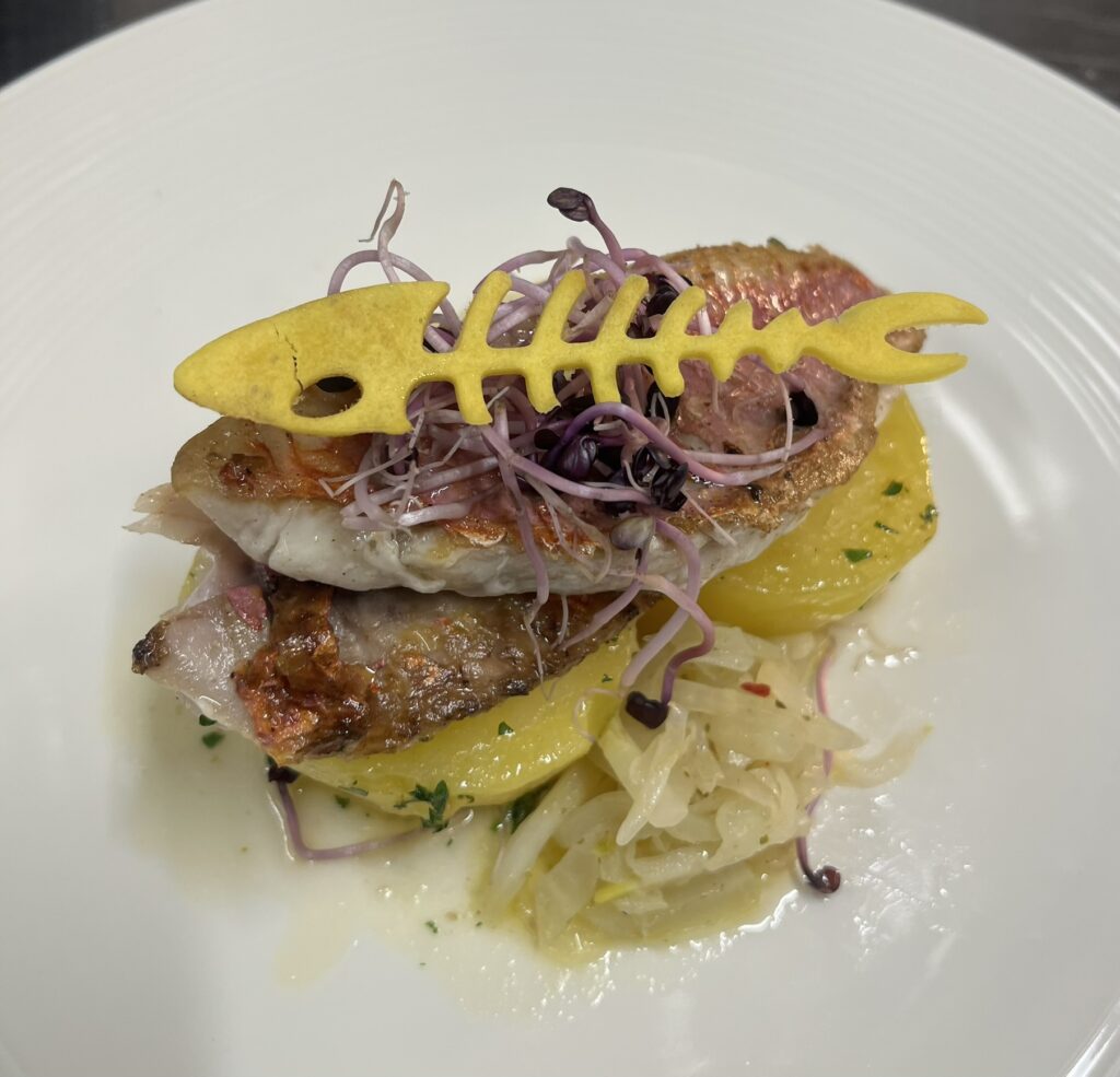 - Zackenbarsch auf Safran-Paprika-Sauce – Beilage: Kartoffelgratin, Butterkarotten
