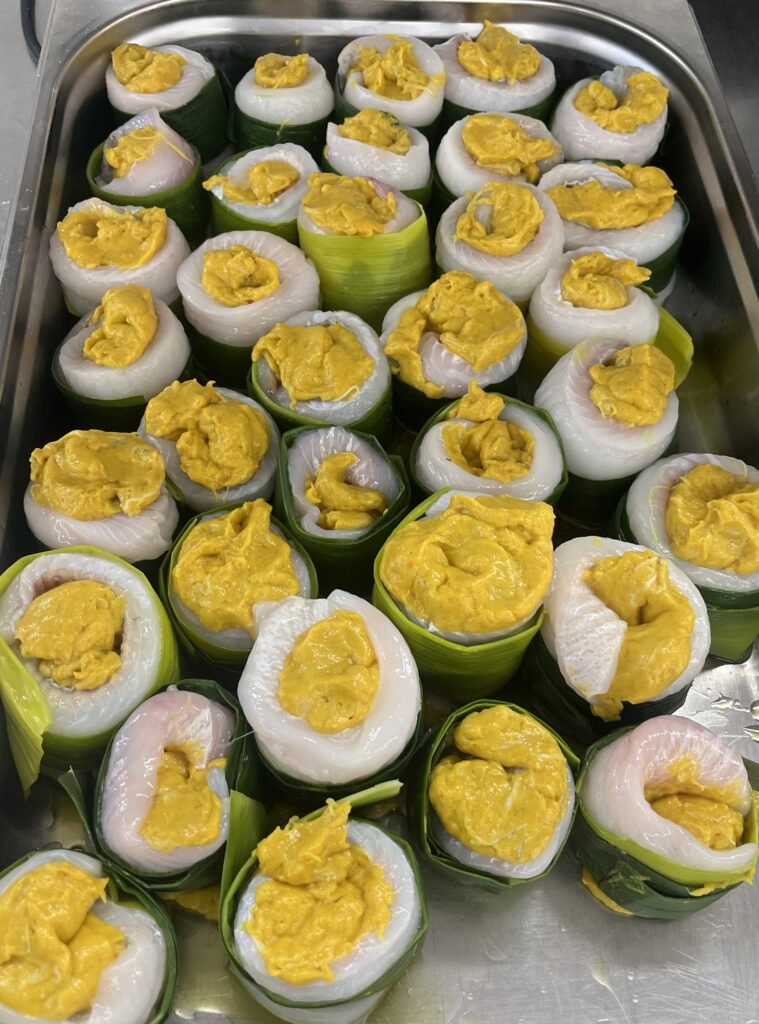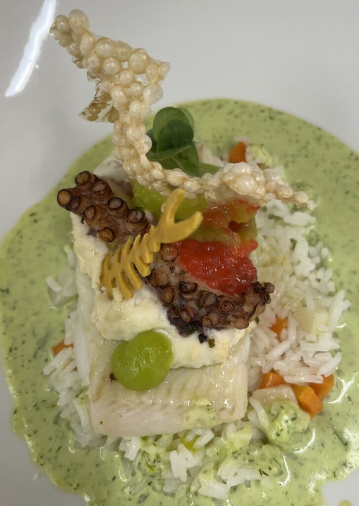 - Red Snapper auf Mango-Limetten-Creme – Beilage: Jasminreis, glasiertes Gemüse