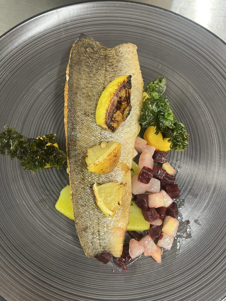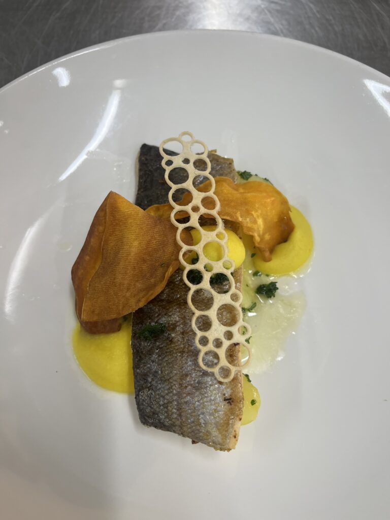 - Wolfsbarsch auf Safran-Karotten-Püree – Beilage: Kartoffelgratin, Zuckerschoten