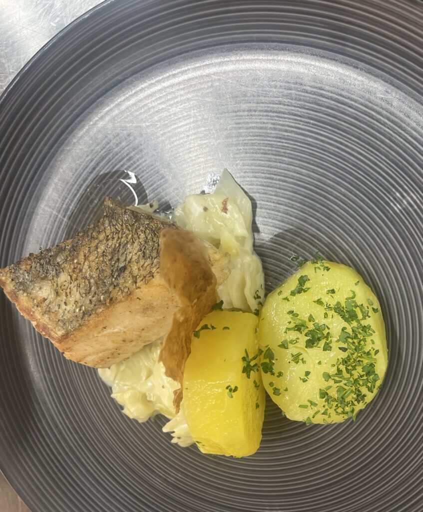 - Wolfsbarschfilet in Trüffelsauce – Beilage: Kartoffelgratin, Butterkarotten