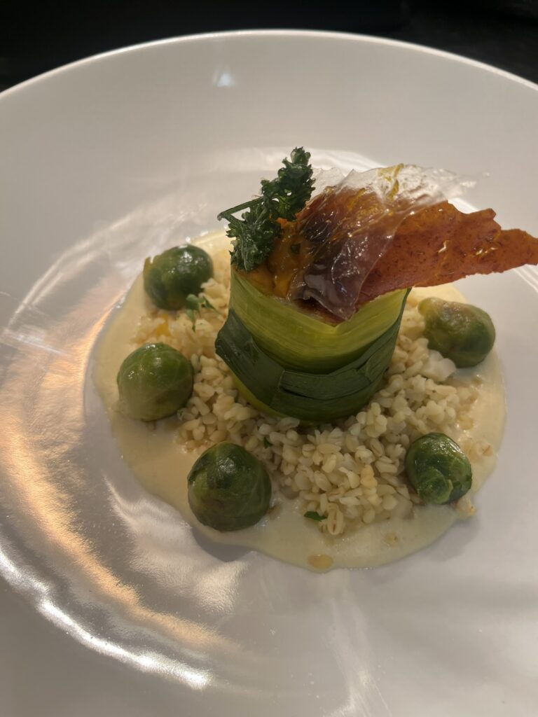 - Zackenbarsch in Orangen-Trüffelsauce – Beilage: Kartoffelgratin, glasiertes Gemüse