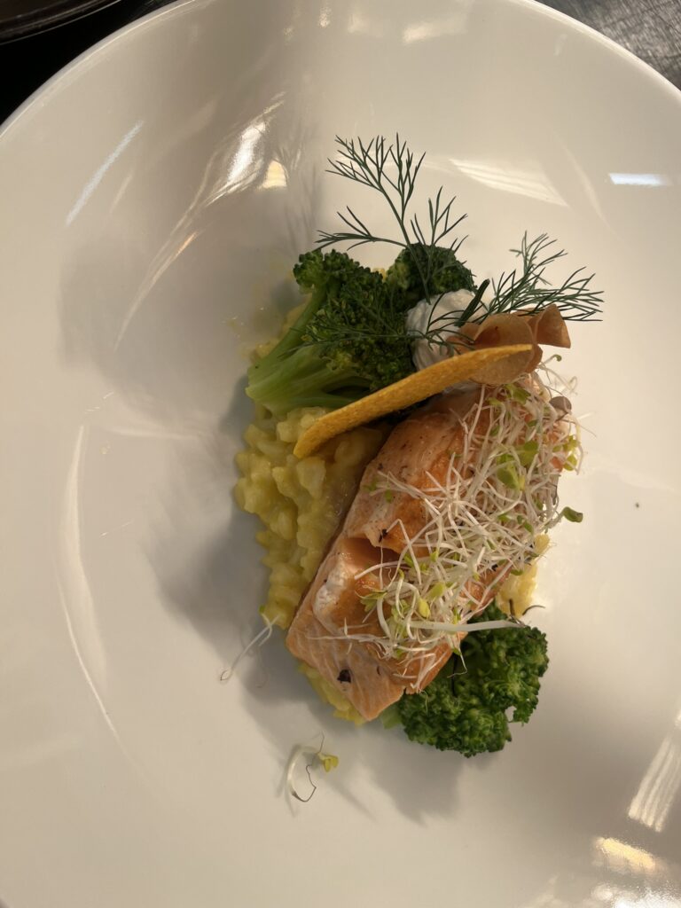 - Lachsfilet auf Safransauce – Beilage: Kartoffelpüree, glasiertes Gemüse