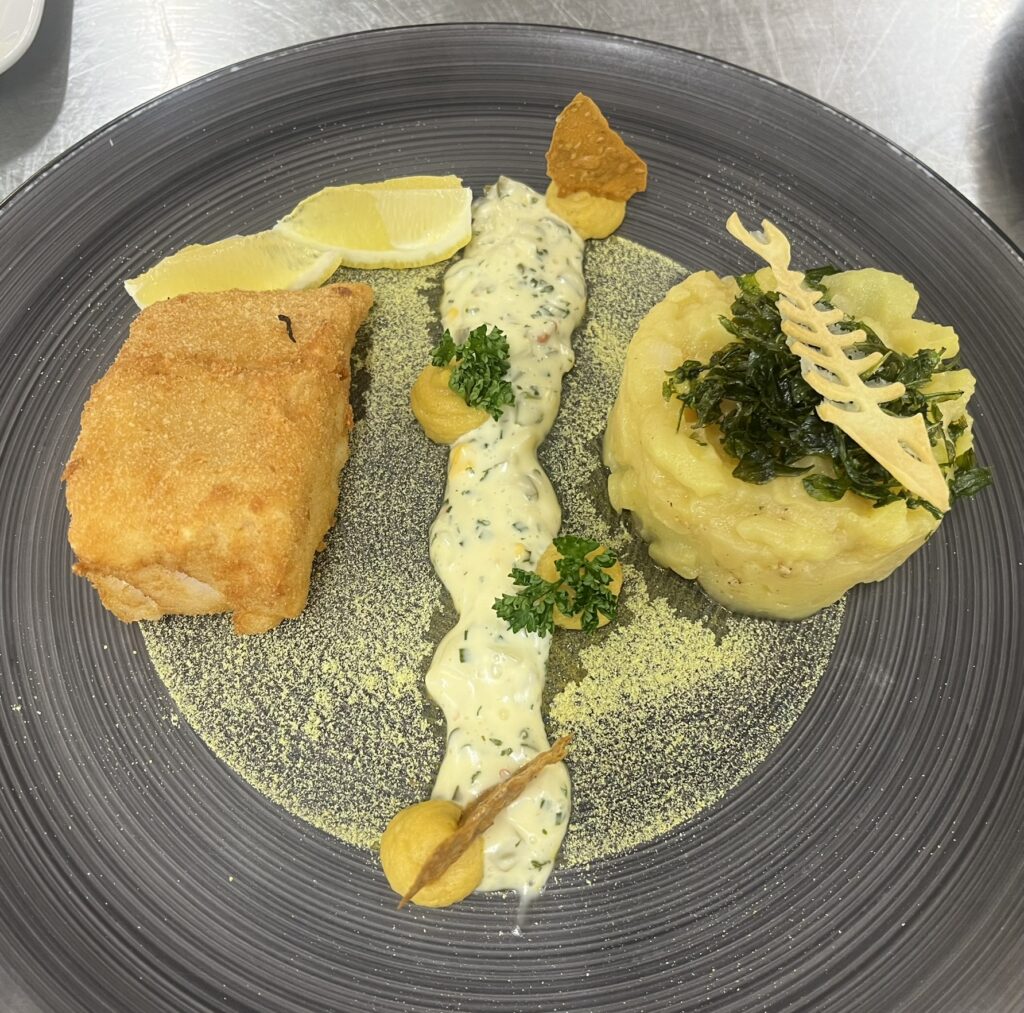 - Mahi-Mahi in Orangen-Trüffel-Sauce – Beilage: Kartoffelpüree, Zuckerschoten