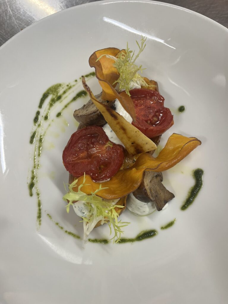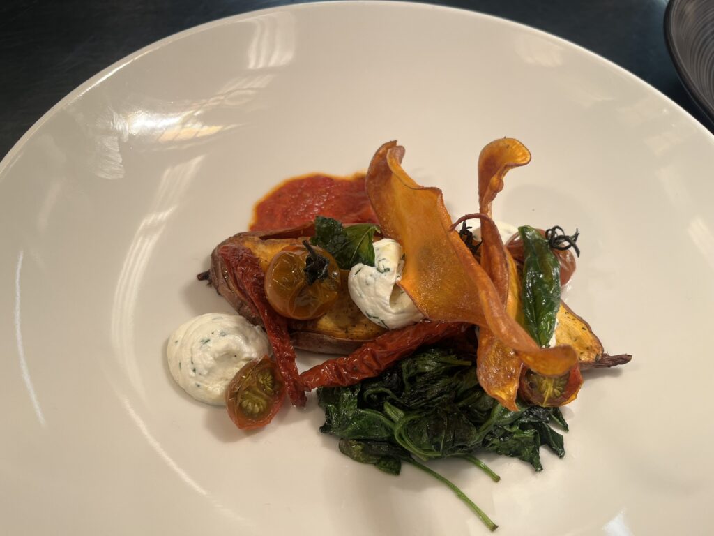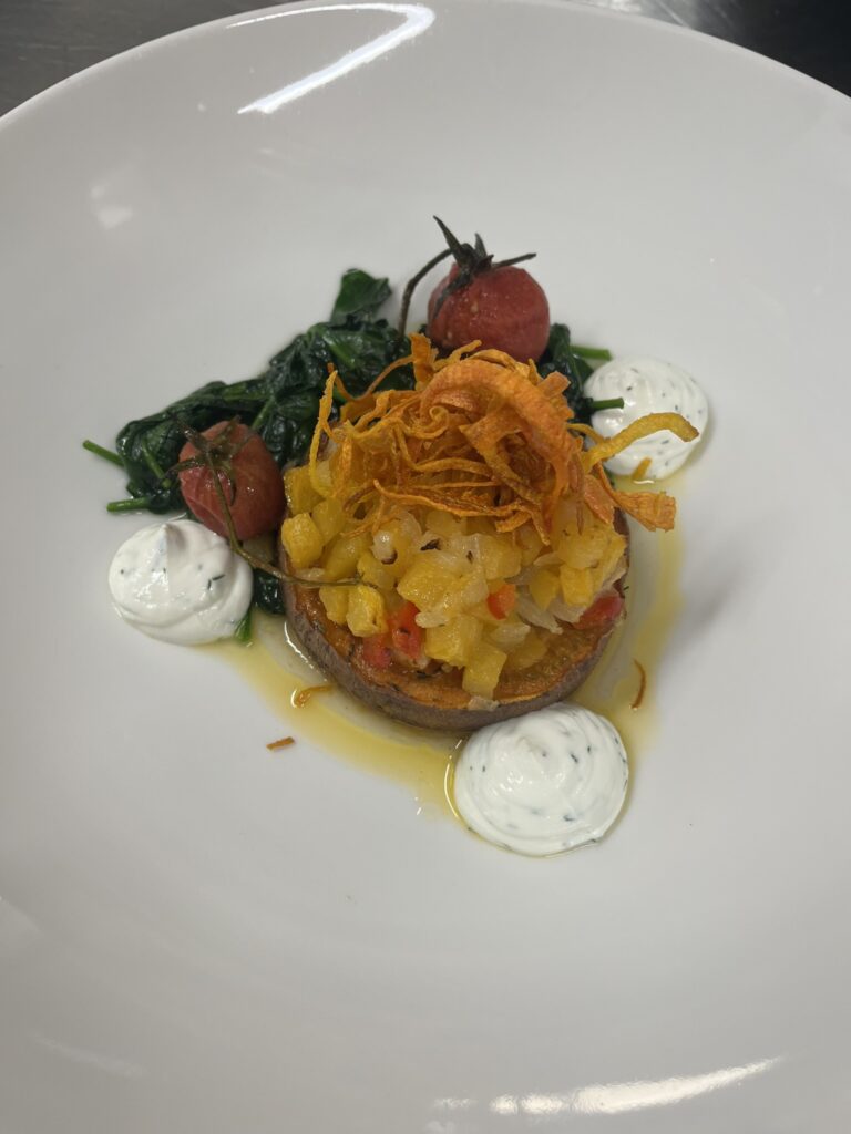 - Burrata-Medaillon auf Safran-Karotten-Püree – Beilage: Kartoffelgratin, glasiertes Gemüse