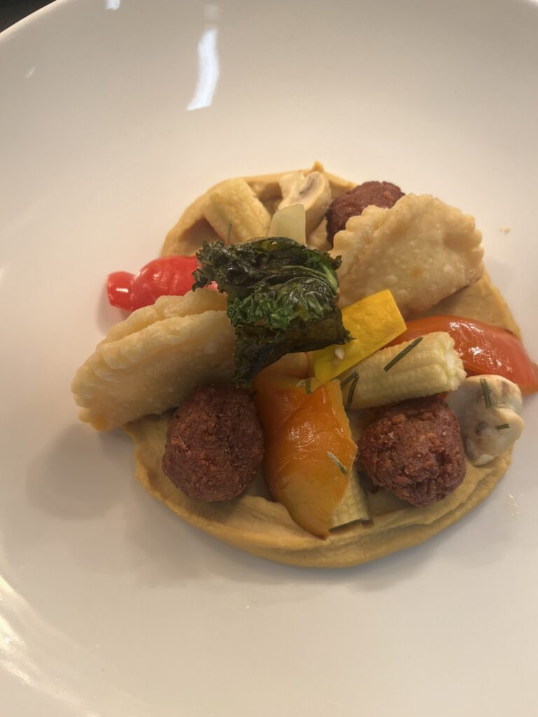 - Ricottapralinen auf Kürbis-Ingwer-Püree – Beilage: Polenta, glasiertes Gemüse