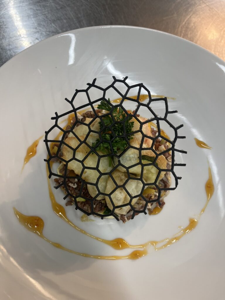 - Rote-Bete-Ravioli auf Walnusspüree – Beilage: Kartoffelpüree, glasiertes Gemüse