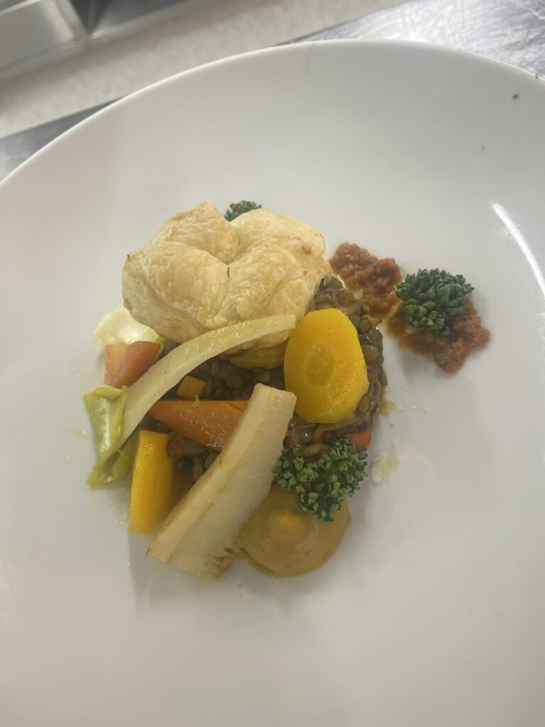 - Blätterteigpraline mit Gemüsefüllung – Beilage: Kartoffelpüree, Zuckerschoten