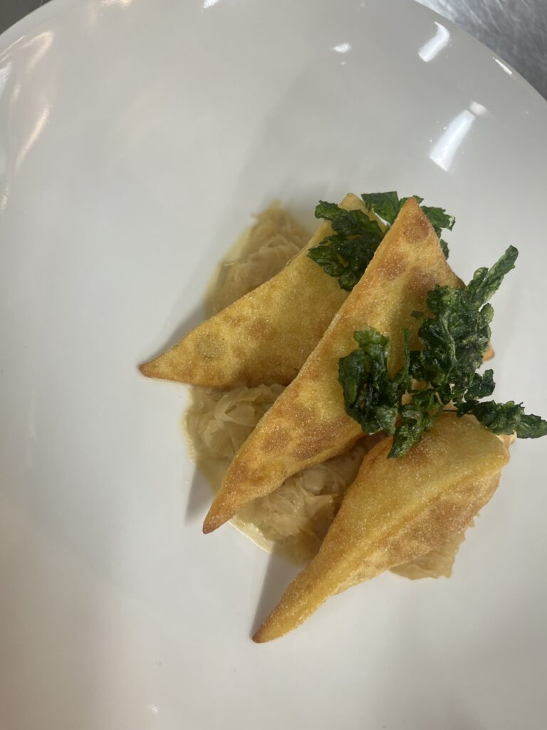 - Blätterteigtaschen mit Kürbisfüllung – Beilage: Polenta, glasiertes Gemüse
