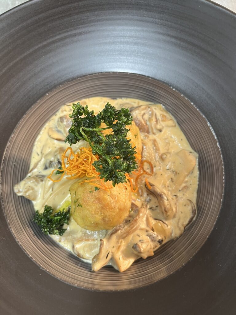 - Burrata-Pralinen auf Pilzragout – Beilage: Kartoffelpüree, glasiertes Gemüse