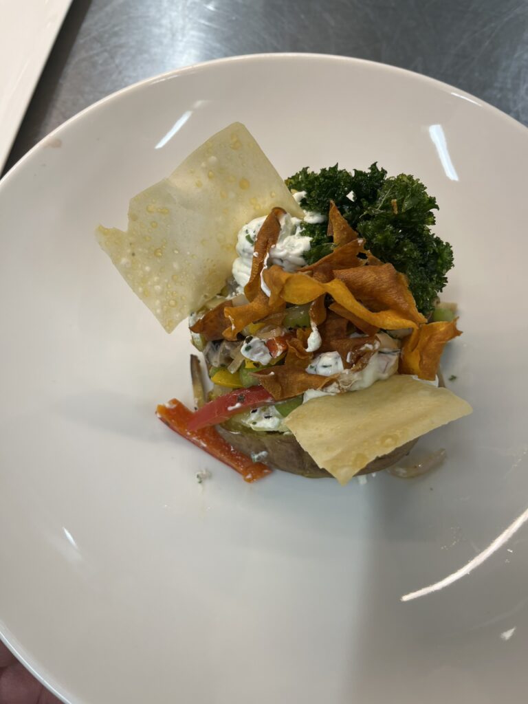 - Ofenkartoffel gefüllt mit Pilzen und Spinat – Beilage: Butterkarotten, Zuckerschoten