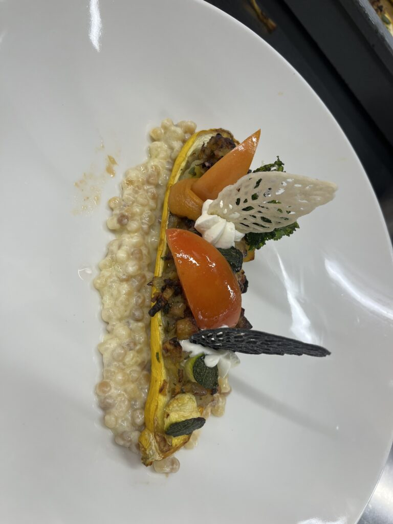 - Gefüllte Zucchini mit Couscous – Beilage: Polenta, glasiertes Gemüse