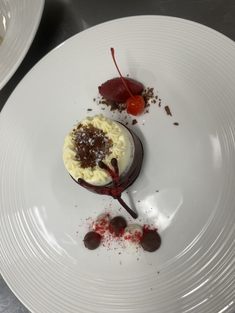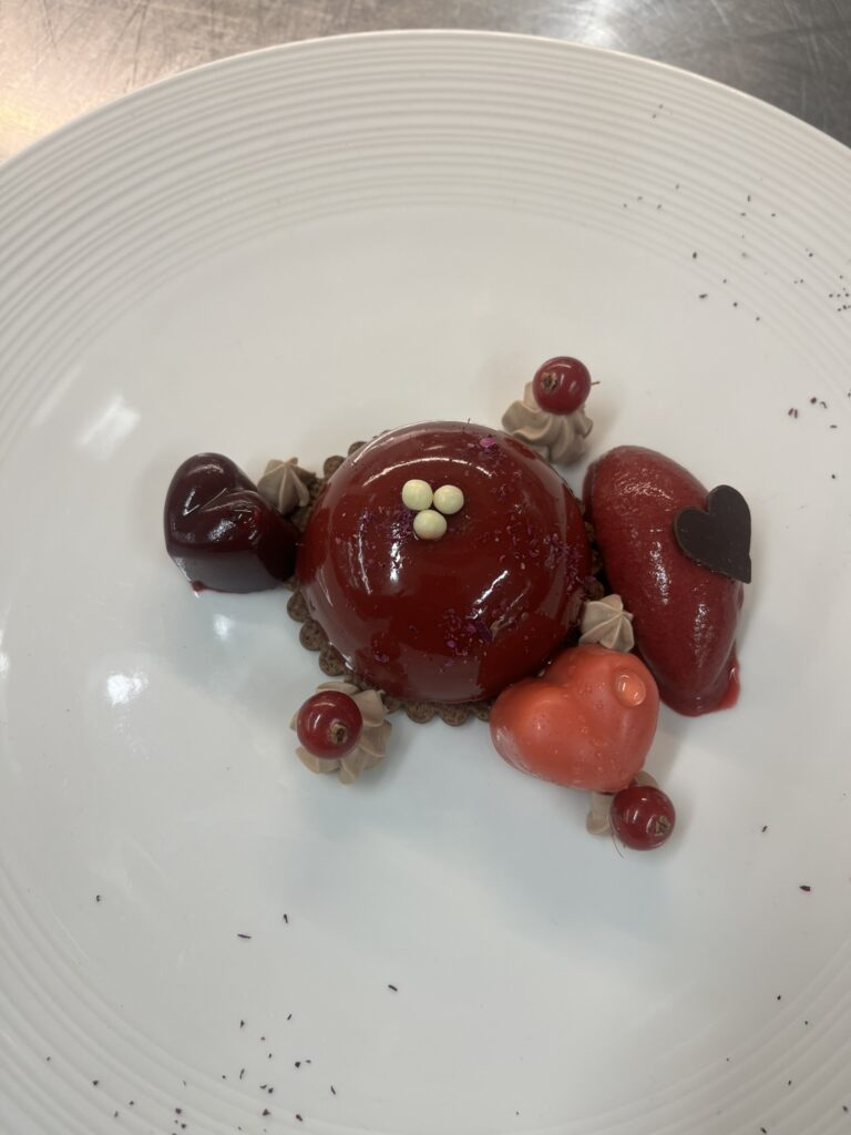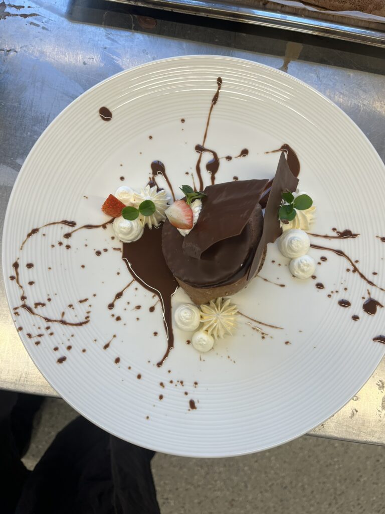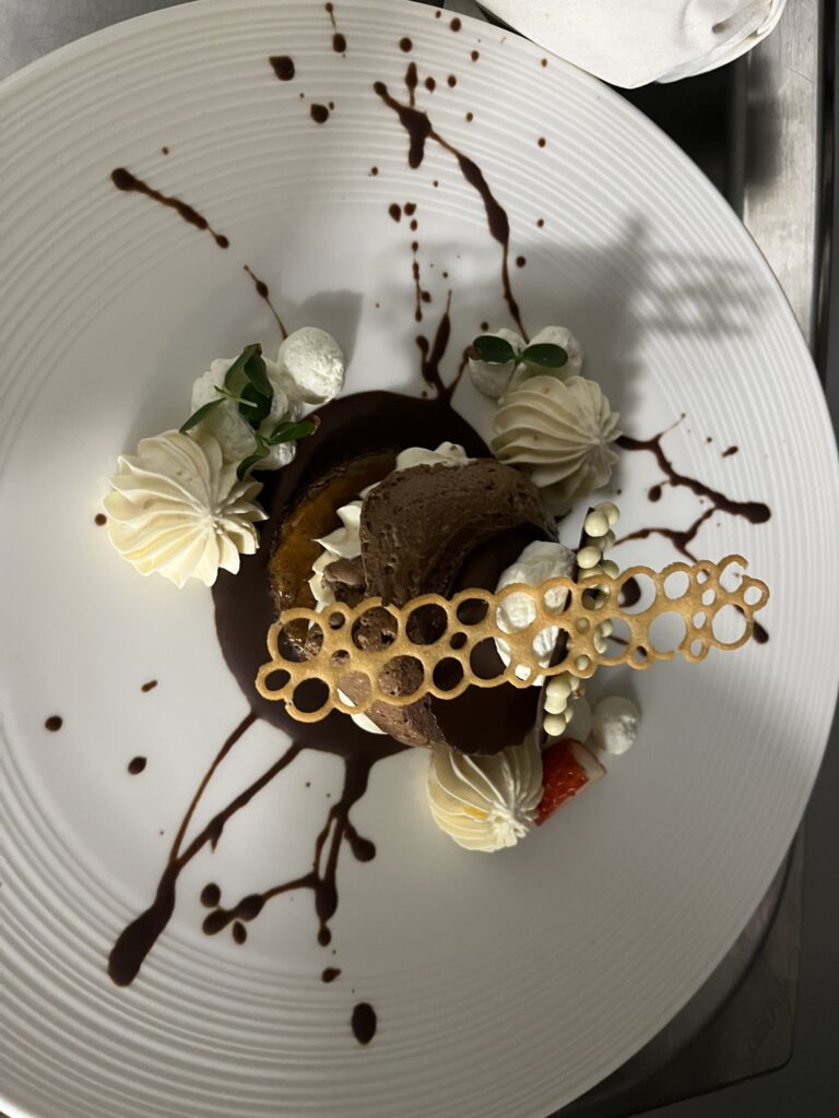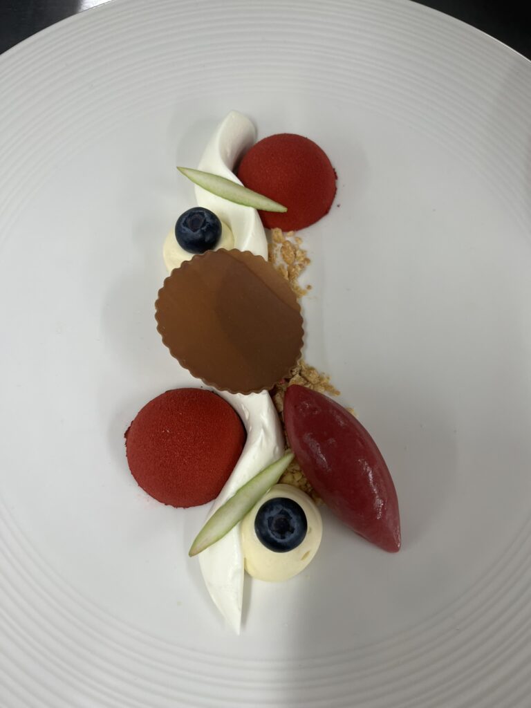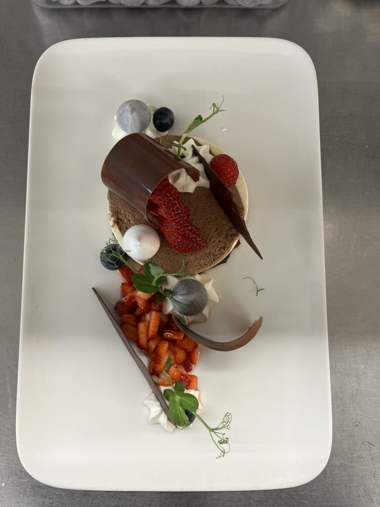 - Dunkle Schokoladenmousse – Salzkaramell, Haselnusskrokant