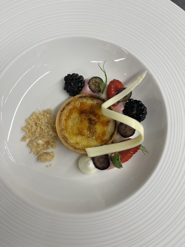 - Crème brûlée klassisch – flach karamellisiert, Beerenstaub